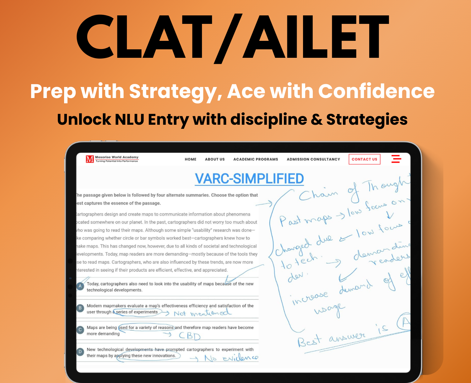 Mesorise World Academy is a leading institution in Delhi NCR-Gurugram, specializing in study abroad tests and admission consultancy, with other competitive exam preparation. We are dedicated to providing quality education and personalized learning experiences with expert coaching for global tests such as SAT, ACT, LNAT, LSAT, GMAT, GRE, and national exams like CAT, CLAT, AILET, CUET, NPAT, XAT, and IPMAT. With personalized study plans, mock tests, and in-depth guidance, Mesorise ensures high scores for students aiming to pursue higher education abroad.