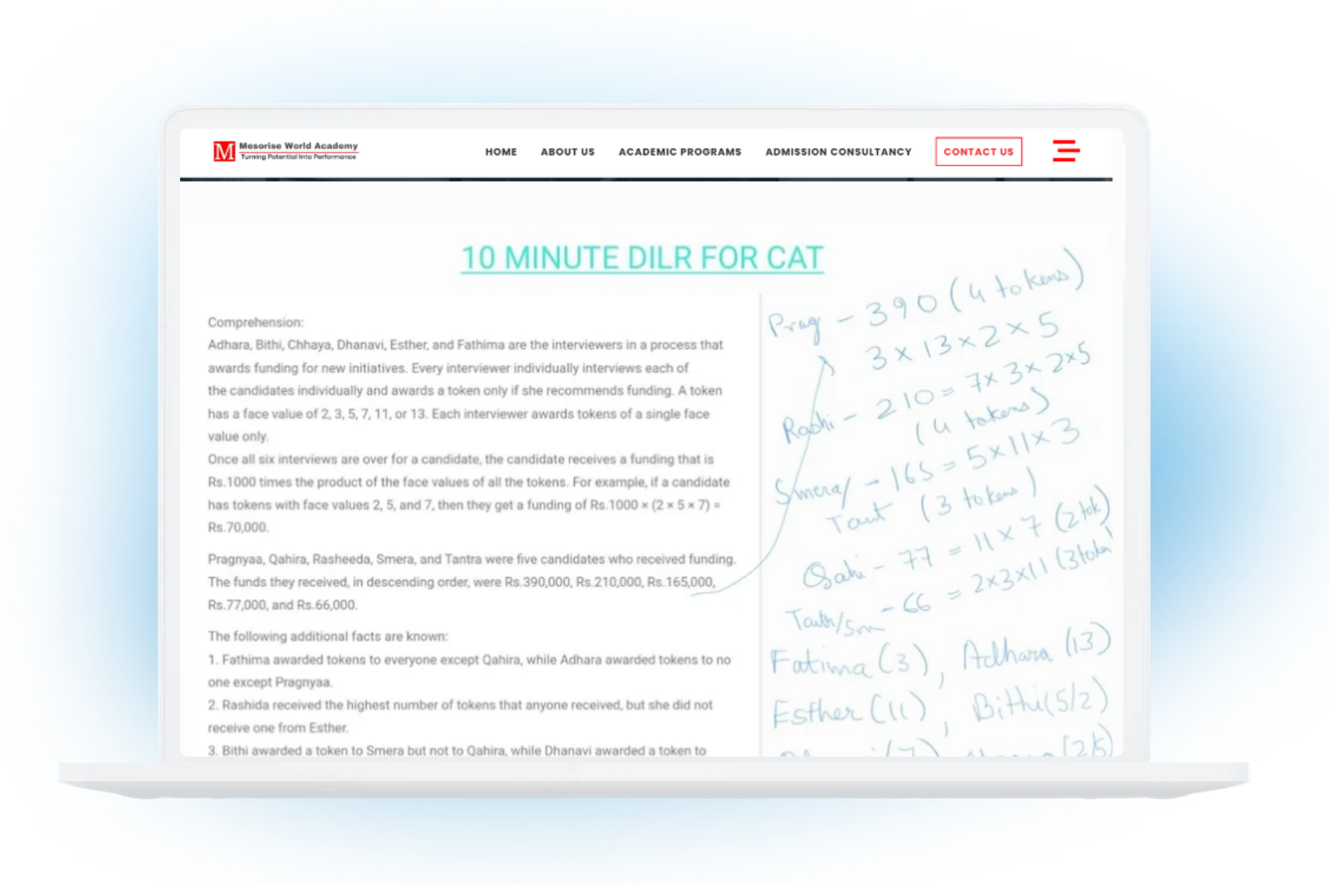 At Mesorise World Academy, we specialize in preparing students for the most competitive management entrance exams in India, including CAT, XAT, IPMAT, NPAT, and MAT. These exams serve as the gateway to top-tier business schools like the IIMs, XLRI, NMIMS, IITs, Christ University, XIMB, and hundreds of other prestigious institutions offering undergraduate and postgraduate programs in management. Whether you're aiming for a top MBA seat through CAT/XAT/MAT or seeking early admission into an integrated BBA+MBA program through IPMAT or NPAT, our courses are strategically crafted to suit every exam structure, difficulty level, and student goal. With expert faculty, mock-driven preparation,and personalized mentorship, Mesorise helps turn your ambition into admission success.